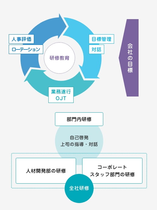 人材育成の基本理念は、「一人ひとりの自己啓発への強い意欲」と「職場上司の部下指導と対話」にあります。「目標管理・対話」、「業務遂行・ OJT 」、「人事評価・ローテーション」のサイクルを研修・教育がサポートし、会社目標の達成を通じて個々人の人材価値の向上を図っていきます。