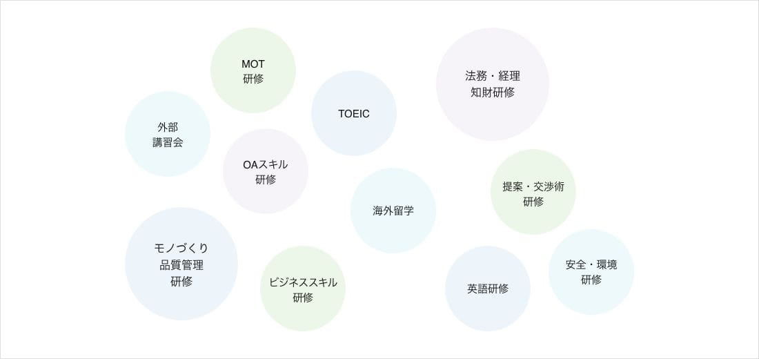住友電工グループの研修体系の総称。会社の目標の達成、Glorious Excellent Companyの実現に向けて幅広い領域にわたってさまざまな研修を実施しています。