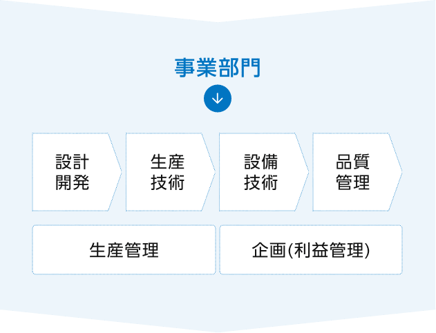 開発した製品を品質面・コスト面で効率よく製造するために電気・機械・材料等生産に関わる多角的な視点から生産ラインの開発を行う生産のエキスパートです。また、新規生産ラインの立ち上げのほか、既存生産ラインの課題抽出と改善、生産能力向上など多岐の業務を手がけます。