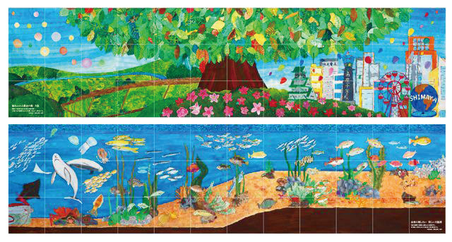 除幕式には、此花区の西原区長や、島屋小学校の武原校長をはじめ、原画を描いて下さった6年生の皆さんにも臨席いただきました。右の写真のアート作品のテーマは「緑あふれる都会のまち大阪」と「未来に残したい美しい大阪湾」です。完成した壁画は、子ども達にも大変喜んでもらいました。子ども達の思いを未来に伝えるとともに、今後も環境に配慮した事業活動を行うことを肝に銘じ、また島屋小学校と当社の友好の証として末永く飾っていきます。