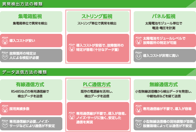 接続箱※2に監視端末を設置し、ストリングごとの電流・電圧を測定します。パワーコンディショナの近くに設置したデータ収集装置にデータを集め、ストリングごとのデータを相対的に比較し、不具合箇所の早期発見と売電収入ロスの最小化を実現します。