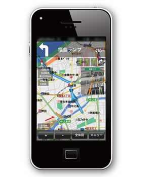 サーバから最新の地図をスマートフォンに配信。地図上に自動車現在位置、走行軌跡、目的地までの推奨経路、渋滞や交通規制といったVICS情報などを表示します。地図をスクロールしたり、縮尺の変更、ノースアップ/ヘディングアップ切替が可能です。
