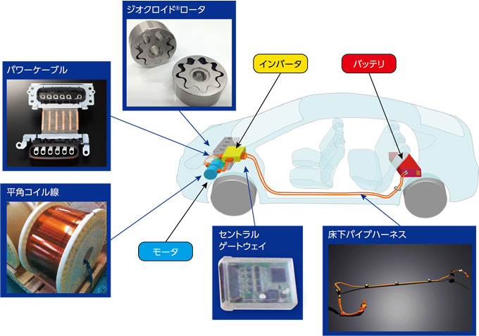 その他にも、車の多チャンネル通信ネットワークを支える「セントラルゲートウェイ」、当社開発歯形の採用によりハイブリッドシステムの効率化に貢献した焼結部品「ジオクロイド®ロータ」、ハイブリッド車のインバータとモータを結ぶ高電圧ハーネス「パワーケーブル」など、数々の製品を開発、量産を開始しています。