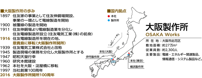 1959年に当社が世界に先駆けて製品化し、その後高電圧化を進め、500kVまで実用化した電力ケーブル「CV(架橋ポリエチレン絶縁ビニルシース)ケーブル」も大阪製作所で製造しています。ここで製造されたケーブルは、日本国内のみならず、海外でも使用され、電力関連インフラ整備に大きく貢献しています。