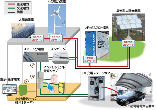太陽光や風力などの再生可能エネルギー発電設備と蓄電池を直流で連系させたマイクロスマートグリッド実証システムを開発し、構内試験をおこなっています。4種類の発電装置と蓄電池を直流で連系させ、自然由来の不安定なエネルギーと、電力の需要を高度に管理することで、安定的かつ効率的に、各種設備や機器に電力を供給することを可能にします。
