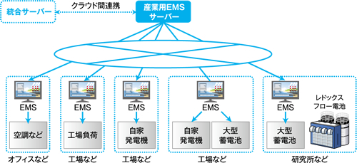 レドックスフロー電池、エンジン発電機やタービン発電機などの自家発電機、オフィス・工場の電力フローを遠隔監視・制御する役割を担います。