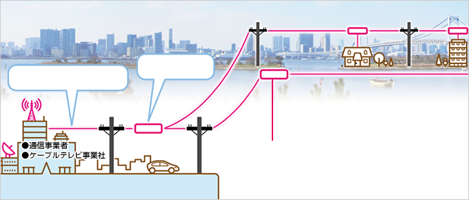 基地局センターと一般家庭を繋ぐ伝送路で、放送や通信の信号を数十km先まで伝搬させることができます。