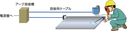 アーク溶接機:アークとは、2つの電極間の放電(アーク放電)で発生するプラズマの一種であり、アーク溶接機はこのアークを利用し母材と電極の間に発生する高熱で同じ金属同士をつなぎ合わせる装置です。