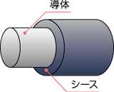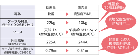 導体に高強度アルミを使用することで、軽量化に加えて、ケーブル取りまわし時の引張(ひっぱ)り力に耐える強度を有しています。また、アルミは銅より電気抵抗が大きく、同じ電流を流すと導体温度が高くなるため、被覆材(シース)に耐熱性を持たせる必要がありました。そこで、当社独自配合技術によって従来品よりも耐熱性を向上したシースを用いることで、導体サイズを大きくすることなく、従来製品と同一サイズでの提供が可能となりました。