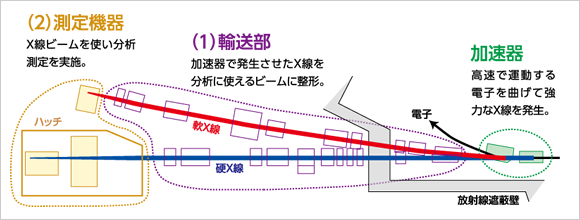 ビームラインとは、(1)加速器から発生させたX線ビームを整形する輸送部、(2)分析をおこなう測定機器、から構成される実験設備です。これまで当社はSPring-8*2などの施設で、ほかの利用者と共用のビームラインを利用してきましたが、今回、九州シンクロトロン光研究センター内に当社グループ専用のビームラインの建設を進め、昨年11月から稼働しました。これにより課題であった利用時間不足を解消し、増加する分析ニーズに迅速に対応できるようになりました。今後、専用ビームラインを活用して製造プロセスや製品特性を革新的に改善し、低コストかつ高品質な製品をより早く提供していきます。