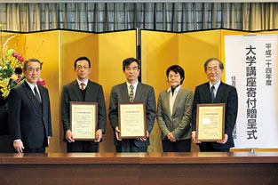 今年度の「大学講座への寄付」については、東日本大震災復興支援の観点から、自然災害に対する防災対策やエネルギー問題、被災地支援など、東日本大震災からの復興に資する研究に取り組む講座を募集し、神戸大学「津波マリンハザード研究講座」、一橋大学「震災・原発事故からの復興に向けた環境法政策講座」の2つの講座が新たに選ばれました。寄付を継続する大阪大学「次世代のものづくり人材育成のための問題解決型機械工学教育の実践講座」とともに、2月14日に寄付金目録の贈呈を行いました。