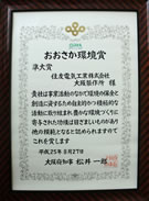 大阪府より、当社、大阪製作所が「グローバルな省エネ診断」において「おおさか環境賞」準大賞を受賞しました。