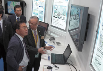 東京都の猪瀬直樹知事が、10月16日、「ITS世界会議 東京2013」の当社グループ展示ブースを視察されました。交通管制システムについてご質問されるなど、説明に熱心に耳を傾けていただきました。